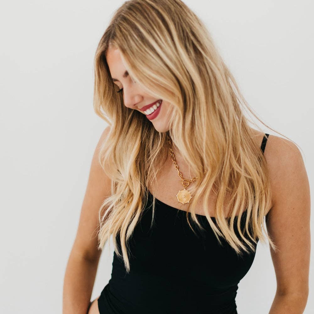 Meet your new favorite waterproof accessory - our Sunburst Diamond Chain Necklace! Available in gold, this necklace features a thick chain, a toggle clasp, and a beautiful sunburst pendant with diamonds on it. This accessory will elevate all your favorite styles.